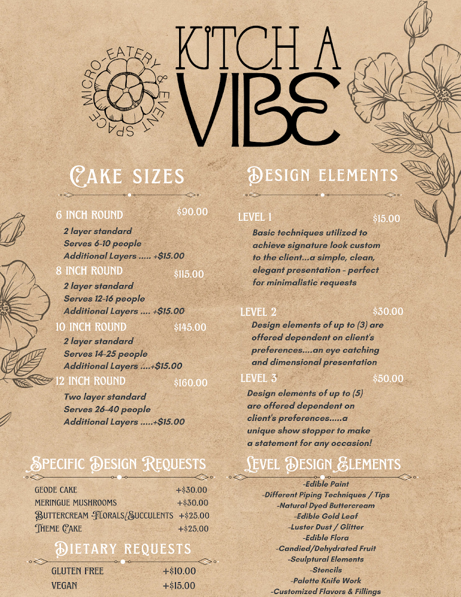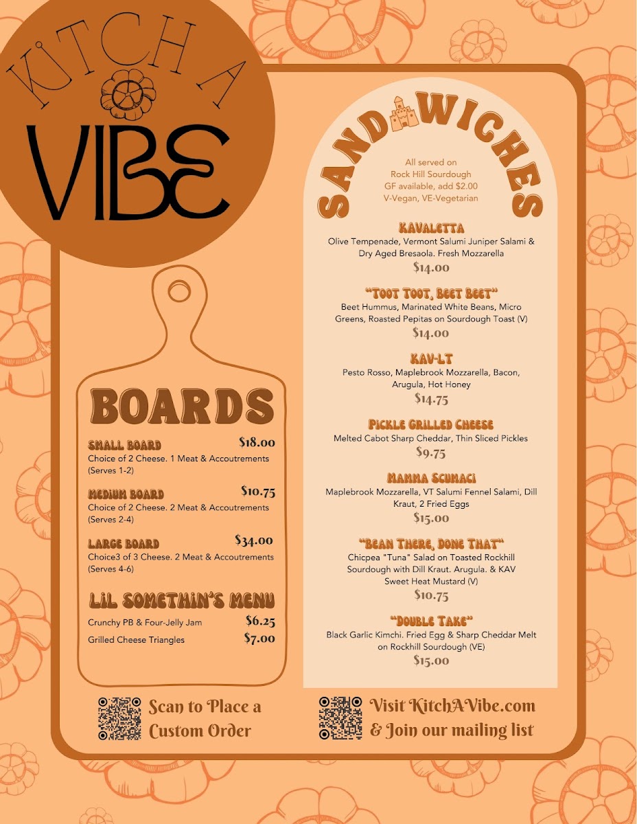 Thirsty? Kitch A Vibe pours a variety of delicious drinks to complement your meal. Sip on a refreshing Curious No. 4 Mocktail or experience the unique flavor of Aura Bora Sparkling Water for just $2.75. For a heartier pick-me-up, their Stinky's Coffee and curated tea blends from Midnight Tease are sure to awaken your senses.